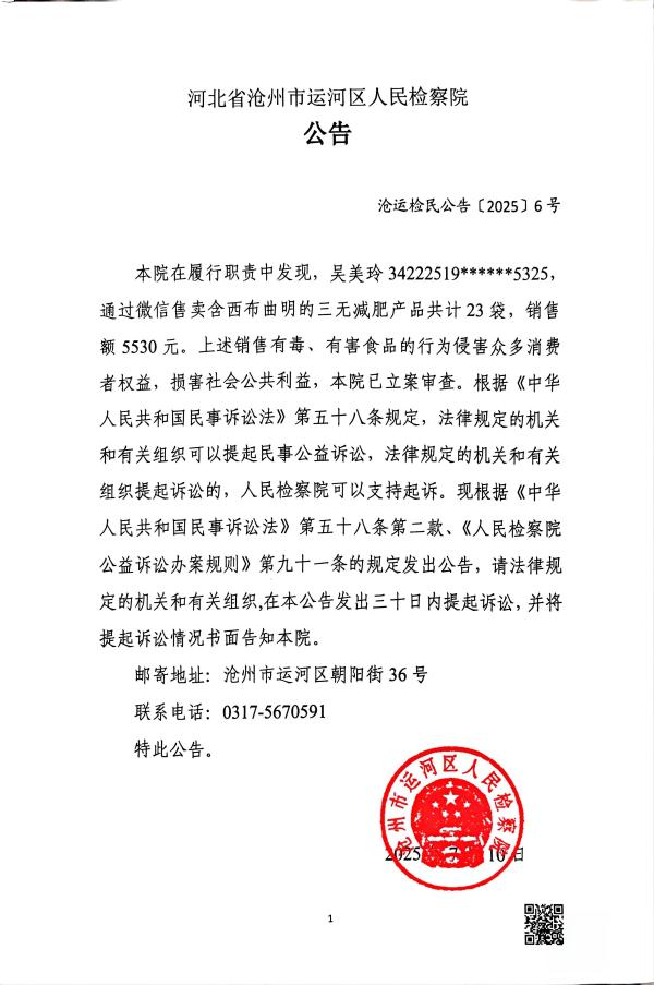 本院在履行职责中发现,吴美玲34222519******5325,通过微信售卖含西布曲明的三无减肥产品共计23袋,销售额5530元。上述销售有毒、有害食品的行为侵害众多消费者权益,损害社会公共利益,本院已立案审查。根据《中华人民共和国民事诉讼法》第五十八条规定,法律规定的机关和有关组织可以提起民事公益诉讼,法律规定的机关和有关组织提起诉讼的,人民检察院可以支持起诉。现根据《中华人民共和国民事诉讼法》第五十八条第二款、《人民检察院公益诉讼办案规则》第九十一条的规定发出公告,请法律规定的机关和有关组织,在本公告发出三十日内提起诉讼,并将提起诉讼情况书面告知本院。