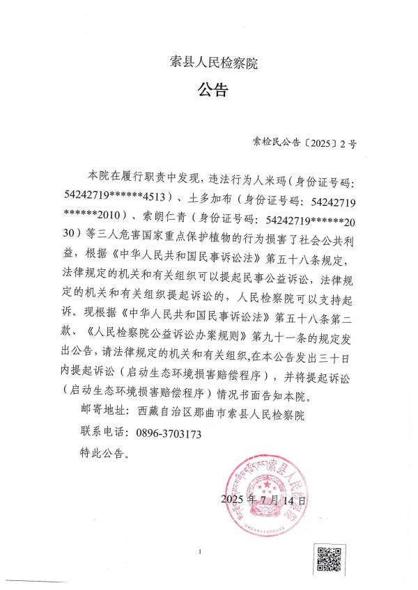 本院在履行职责中发现,违法行为人米玛(身份证号码:54242719******4513)、土多加布(身份证号码:54242719******2010)、索朗仁青(身份证号码:54242719******2030)等三人危害国家重点保护植物的行为损害了社会公共利益,根据《中华人民共和国民事诉讼法》第五十八条规定,法律规定的机关和有关组织可以提起民事公益诉讼,法律规定的机关和有关组织提起诉讼的,人民检察院可以支持起诉。现根据《中华人民共和国民事诉讼法》第五十八条第二款、《人民检察院公益诉讼办案规则》第九十一条的规定发出公告,请法律规定的机关和有关组织,在本公告发出三十日内提起诉讼(启动生态环境损害赔偿程序),并将提起诉讼(启动生态环境损害赔偿程序)情况书面告知本院。