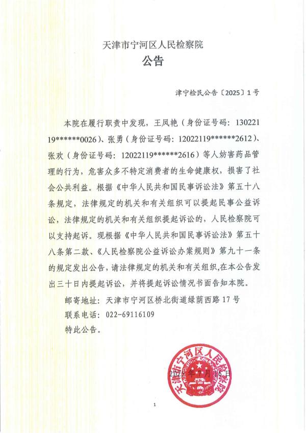 本院在履行职责中发现,王凤艳(身份证号码:13022119******0026)、张勇(身份证号码:12022119******2612)、张欢(身份证号码:12022119******2616)等人妨害药品管理的行为,危害众多不特定消费者的生命健康权,损害了社会公共利益。根据《中华人民共和国民事诉讼法》第五十八条规定,法律规定的机关和有关组织可以提起民事公益诉讼,法律规定的机关和有关组织提起诉讼的,人民检察院可以支持起诉。现根据《中华人民共和国民事诉讼法》第五十八条第二款、《人民检察院公益诉讼办案规则》第九十一条的规定发出公告,请法律规定的机关和有关组织,在本公告发出三十日内提起诉讼,并将提起诉讼情况书面告知本院。