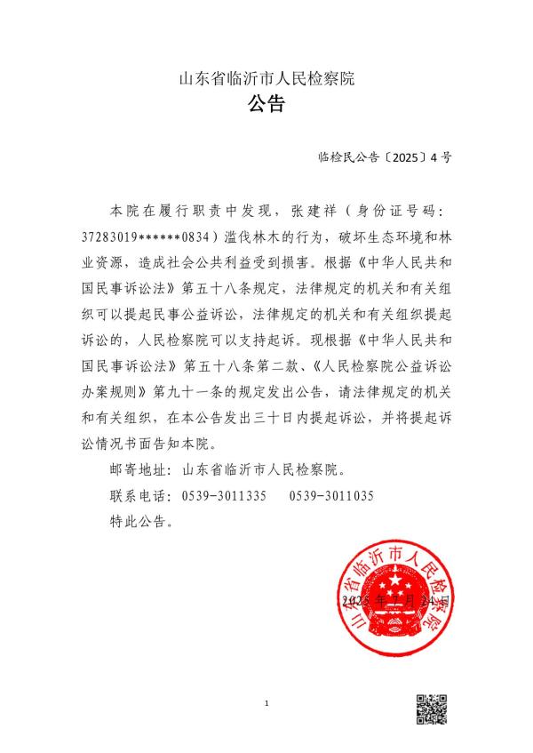 本院在履行职责中发现,张建祥(身份证号码:37283019******0834)滥伐林木的行为,破坏生态环境和林业资源,造成社会公共利益受到损害。根据《中华人民共和国民事诉讼法》第五十八条规定,法律规定的机关和有关组织可以提起民事公益诉讼,法律规定的机关和有关组织提起诉讼的,人民检察院可以支持起诉。现根据《中华人民共和国民事诉讼法》第五十八条第二款、《人民检察院公益诉讼办案规则》第九十一条的规定发出公告,请法律规定的机关和有关组织,在本公告发出三十日内提起诉讼,并将提起诉讼情况书面告知本院。
