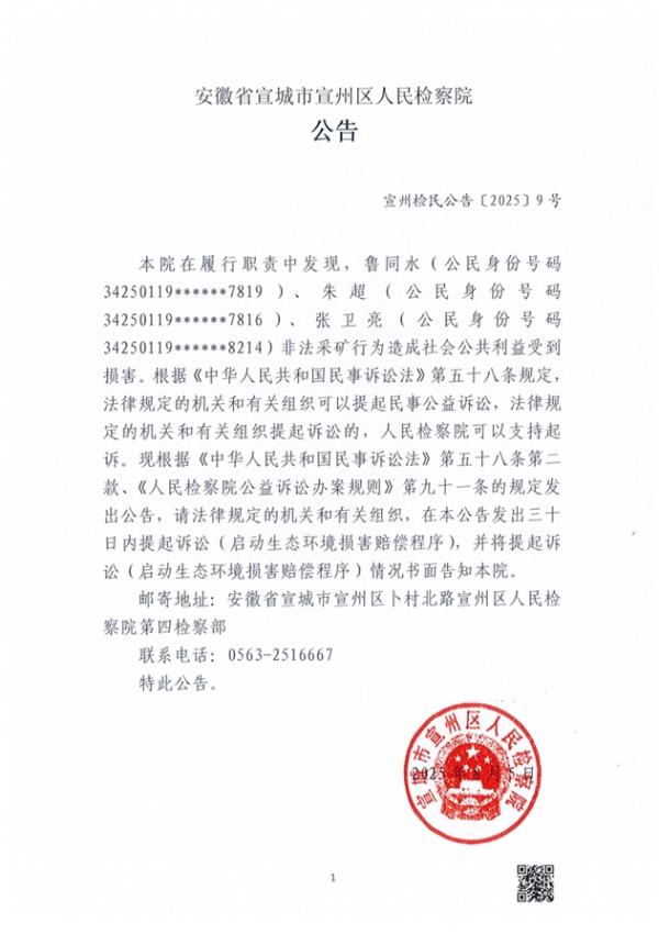 本院在履行职责中发现,鲁同水(公民身份号码34250119******7819)、朱超(公民身份号码34250119******7816)、张卫亮(公民身份号码34250119******8214)非法采矿行为造成社会公共利益受到损害。根据《中华人民共和国民事诉讼法》第五十八条规定,法律规定的机关和有关组织可以提起民事公益诉讼,法律规定的机关和有关组织提起诉讼的,人民检察院可以支持起诉。现根据《中华人民共和国民事诉讼法》第五十八条第二款、《人民检察院公益诉讼办案规则》第九十一条的规定发出公告,请法律规定的机关和有关组织,在本公告发出三十日内提起诉讼(启动生态环境损害赔偿程序),并将提起诉讼(启动生态环境损害赔偿程序)情况书面告知本院。