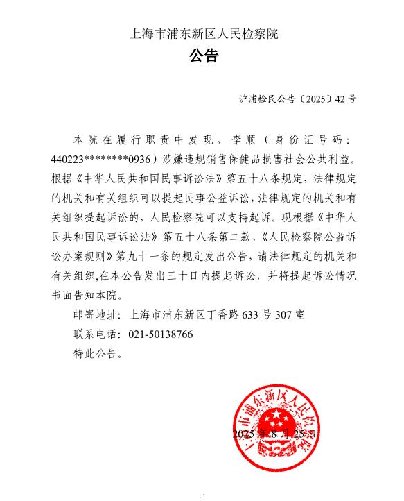 本院在履行职责中发现,李顺(身份证号码:440223********0936)涉嫌违规销售保健品损害社会公共利益。根据《中华人民共和国民事诉讼法》第五十八条规定,法律规定的机关和有关组织可以提起民事公益诉讼,法律规定的机关和有关组织提起诉讼的,人民检察院可以支持起诉。现根据《中华人民共和国民事诉讼法》第五十八条第二款、《人民检察院公益诉讼办案规则》第九十一条的规定发出公告,请法律规定的机关和有关组织,在本公告发出三十日内提起诉讼,并将提起诉讼情况书面告知本院。