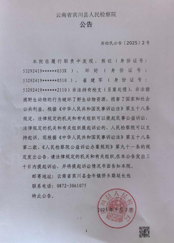 本院在履行职责中发现,熊旺(身份证号:53292419******033X)、环好(身份证号:53292419******0510)、崔建军(身份证号:53292419******2110)非法持有枪支(另案处理)、非法猎捕野生动物的行为破坏了野生动物资源,损害了国家和社会公共利益。根据《中华人民共和国民事诉讼法》第五十八条规定,法律规定的机关和有关组织可以提起民事公益诉讼,法律规定的机关和有关组织提起诉讼的,人民检察院可以支持起诉。现根据《中华人民共和国民事诉讼法》第五十八条第二款、《人民检察院公益诉讼办案规则》第九十一条的规定发出公告,请法律规定的机关和有关组织,在本公告发出三十日内提起诉讼,并将提起诉讼情况书面告知本院。