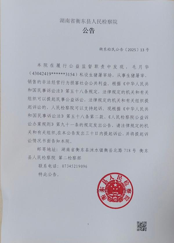 本院在履行公益监督职责中发现,毛月华(43042419******3154)私设生猪屠宰场,从事生猪屠宰、销售的非法经营行为损害社会公共利益。根据《中华人民共和国民事诉讼法》第五十八条规定,法律规定的机关和有关组织可以提起民事公益诉讼,法律规定的机关和有关组织提起诉讼的,人民检察院可以支持起诉。现根据《中华人民共和国民事诉讼法》第五十八条第二款、《人民检察院公益诉讼办案规则》第九十一条的规定发出公告,请法律规定的机关和有关组织,在本公告发出三十日内提起诉讼,并将提起诉讼情况书面告知本院。