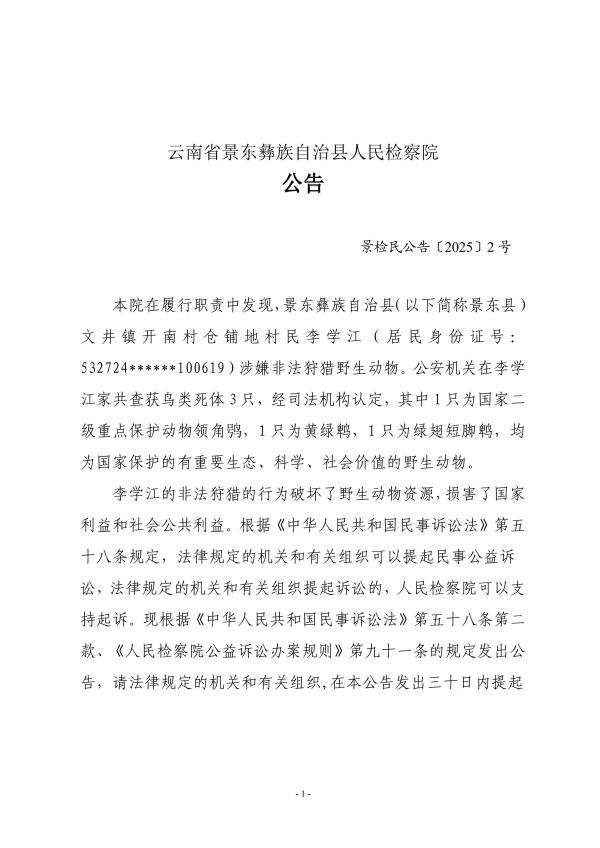 本院在履行职责中发现,景东彝族自治县(以下简称景东县)文井镇开南村仓铺地村民李学江(居民身份证号:532724******100619)涉嫌非法狩猎野生动物。公安机关在李学江家共查获鸟类死体3只,经司法机构认定,其中1只为国家二级重点保护动物领角鸮,1只为黄绿鹎,1只为绿翅短脚鹎,均为国家保护的有重要生态、科学、社会价值的野生动物。