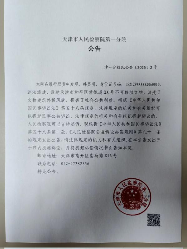 本院在履行职责中发现,韩某明,身份证号码:152129XXXXXX060010,违法添建、改建天津市和平区常德道XX号不可移动文物,改变了文物建筑外檐风貌,损害了社会公共利益。根据《中华人民共和国民事诉讼法》第五十八条规定,法律规定的机关和有关组织可以提起民事公益诉讼,法律规定的机关和有关组织提起诉讼的,人民检察院可以支持起诉。现根据《中华人民共和国民事诉讼法》第五十八条第二款、《人民检察院公益诉讼办案规则》第九十一条的规定发出公告,请法律规定的机关和有关组织,在本公告发出三十日内提起诉讼,并将提起诉讼情况书面告知本院。
