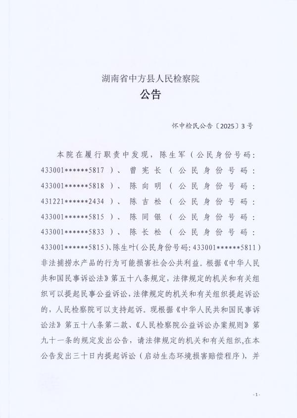 本院在履行职责中发现,陈生军(公民身份号码:433001******5817)、曾宪长(公民身份号码:433001******5818)、陈向明(公民身份号码:431221******2434)、陈吉松(公民身份号码:433001******5815)、陈同银(公民身份号码:433001******5833)、陈长松(公民身份号码:433001******5815)、陈生叶(公民身份号码:433001******5811)非法捕捞水产品的行为可能损害社会公共利益。根据《中华人民共和国民事诉讼法》第五十八条规定,法律规定的机关和有关组织可以提起民事公益诉讼,法律规定的机关和有关组织提起诉讼的,人民检察院可以支持起诉。现根据《中华人民共和国民事诉讼法》第五十八条第二款、《人民检察院公益诉讼办案规则》第九十一条的规定发出公告,请法律规定的机关和有关组织,在本公告发出三十日内提起诉讼(启动生态环境损害赔偿程序),并将提起诉讼(启动生态环境损害赔偿程序)情况书面告知本院。
