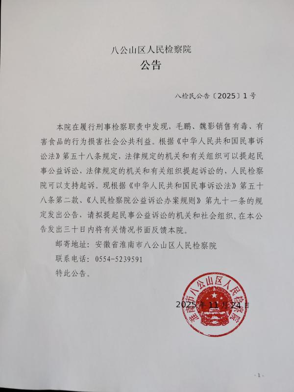本院在履行刑事检察职责中发现,毛鹏、魏影销售有毒、有害食品的行为损害社会公共利益。根据《中华人民共和国民事诉讼法》第五十八条规定,法律规定的机关和有关组织可以提起民事公益诉讼,法律规定的机关和有关组织提起诉讼的,人民检察院可以支持起诉。现根据《中华人民共和国民事诉讼法》第五十八条第二款、《人民检察院公益诉讼办案规则》第九十一条的规定发出公告,请拟提起民事公益诉讼的机关和社会组织,在本公告发出三十日内将有关情况书面反馈本院。