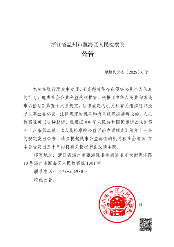 本院在履行职责中发现,王光彪可能存在侵害公民个人信息的行为,造成社会公共利益受到损害。根据《中华人民共和国民事诉讼法》第五十八条规定,法律规定的机关和有关组织可以提起民事公益诉讼,法律规定的机关和有关组织提起诉讼的,人民检察院可以支持起诉。现根据《中华人民共和国民事诉讼法》第五十八条第二款、《人民检察院公益诉讼办案规则》第九十一条的规定发出公告,请拟提起民事公益诉讼的机关和社会组织,在本公告发出三十日内将有关情况书面反馈本院。
