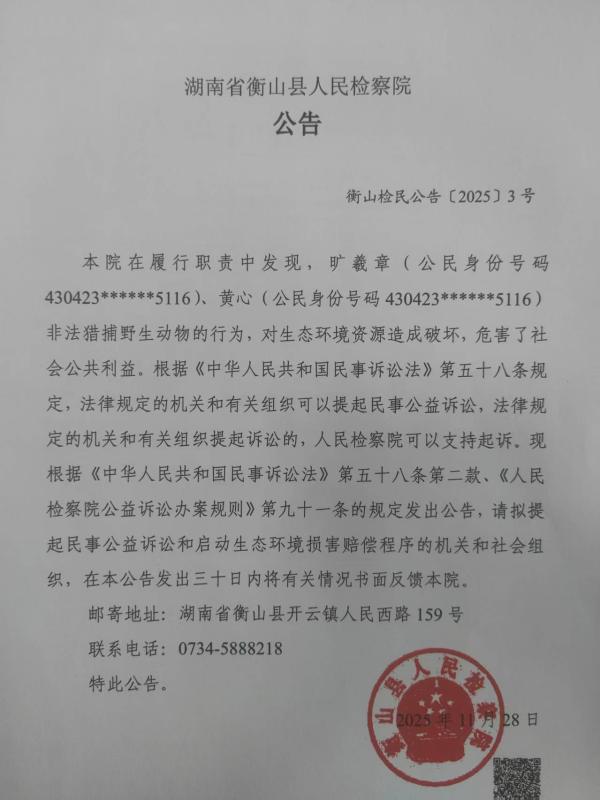 本院在履行职责中发现,旷羲章(公民身份号码430423******5116)、黄心(公民身份号码430423******5116)非法猎捕野生动物的行为,对生态环境资源造成破坏,危害了社会公共利益。根据《中华人民共和国民事诉讼法》第五十八条规定,法律规定的机关和有关组织可以提起民事公益诉讼,法律规定的机关和有关组织提起诉讼的,人民检察院可以支持起诉。现根据《中华人民共和国民事诉讼法》第五十八条第二款、《人民检察院公益诉讼办案规则》第九十一条的规定发出公告,请拟提起民事公益诉讼和启动生态环境损害赔偿程序的机关和社会组织,在本公告发出三十日内将有关情况书面反馈本院。