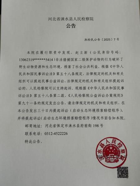 本院在履行职责中发现,赵立新(公民身份号码:13062319******5414)非法猎捕国家二级保护动物的行为破坏了野生动物资源和生态环境,损害了社会公共利益。根据《中华人民共和国民事诉讼法》第五十八条规定,法律规定的机关和有关组织可以提起民事公益诉讼,法律规定的机关和有关组织提起诉讼的,人民检察院可以支持起诉。现根据《中华人民共和国民事诉讼法》第五十八条第二款、《人民检察院公益诉讼办案规则》第九十一条的规定发出公告,请法律规定的机关和有关组织,在本公告发出三十日内提起诉讼(启动生态环境损害赔偿程序),并将提起诉讼(启动生态环境损害赔偿程序)情况书面告知本院。