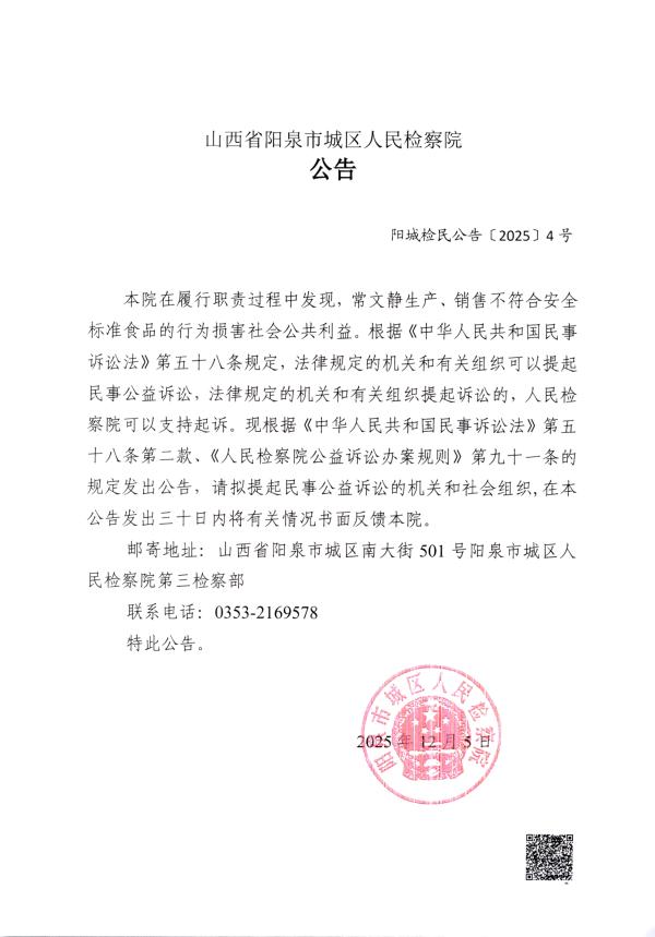 本院在履行职责过程中发现,常文静生产、销售不符合安全标准食品的行为损害社会公共利益。根据《中华人民共和国民事诉讼法》第五十八条规定,法律规定的机关和有关组织可以提起民事公益诉讼,法律规定的机关和有关组织提起诉讼的,人民检察院可以支持起诉。现根据《中华人民共和国民事诉讼法》第五十八条第二款、《人民检察院公益诉讼办案规则》第九十一条的规定发出公告,请拟提起民事公益诉讼的机关和社会组织,在本公告发出三十日内将有关情况书面反馈本院。