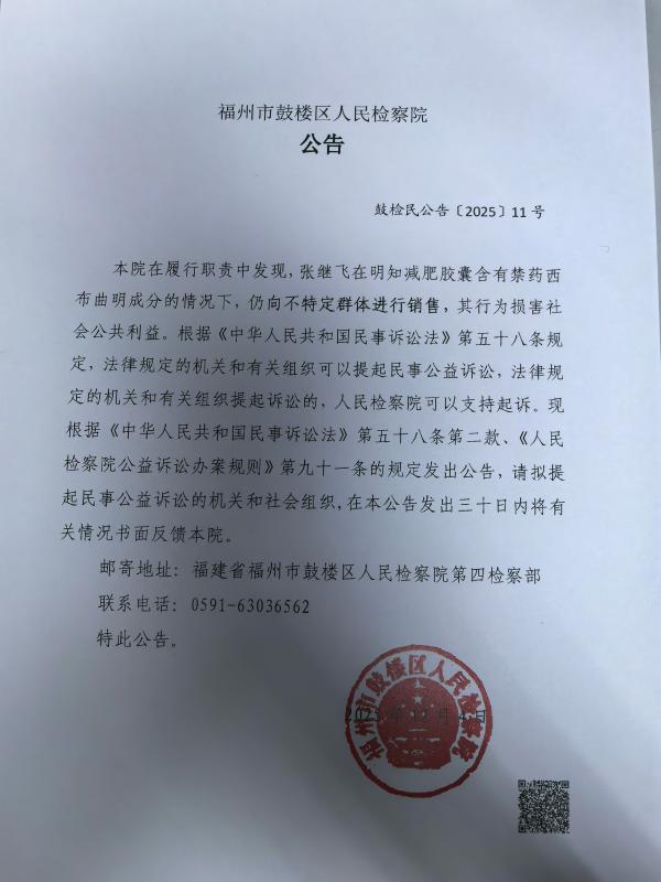 本院在履行职责中发现,张继飞在明知减肥胶囊含有禁药西布曲明成分的情况下,仍向不特定群体进行销售,其行为损害社会公共利益。根据《中华人民共和国民事诉讼法》第五十八条规定,法律规定的机关和有关组织可以提起民事公益诉讼,法律规定的机关和有关组织提起诉讼的,人民检察院可以支持起诉。现根据《中华人民共和国民事诉讼法》第五十八条第二款、《人民检察院公益诉讼办案规则》第九十一条的规定发出公告,请拟提起民事公益诉讼的机关和社会组织,在本公告发出三十日内将有关情况书面反馈本院。