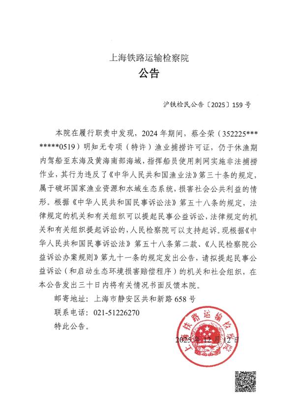 本院在履行职责中发现,2024年期间,蔡全荣(352225********0519)明知无专项(特许)渔业捕捞许可证,仍于休渔期内驾船至东海及黄海南部海域,指挥船员使用刺网实施非法捕捞作业,其行为违反了《中华人民共和国渔业法》第三十条的规定,属于破坏国家渔业资源和水域生态系统,损害社会公共利益的情形。根据《中华人民共和国民事诉讼法》第五十八条的规定,法律规定的机关和有关组织可以提起民事公益诉讼,法律规定的机关和有关组织提起诉讼的,人民检察院可以支持起诉。现根据《中华人民共和国民事诉讼法》第五十八条第二款、《人民检察院公益诉讼办案规则》第九十一条的规定发出公告,请拟提起民事公益诉讼(和启动生态环境损害赔偿程序)的机关和社会组织,在本公告发出三十日内将有关情况书面反馈本院。