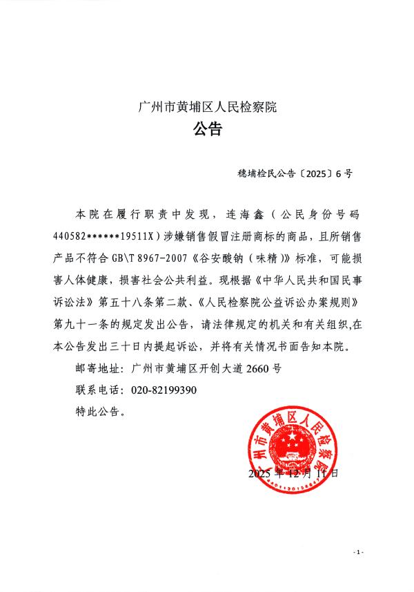 本院在履行职责中发现,连海鑫(公民身份号码440582******19511X)涉嫌销售假冒注册商标的商品,且所销售产品不符合GB\T8967-2007《谷安酸钠(味精)》标准,可能损害人体健康,损害社会公共利益。现根据《中华人民共和国民事诉讼法》第五十八条第二款、《人民检察院公益诉讼办案规则》第九十一条的规定发出公告,请法律规定的机关和有关组织,在本公告发出三十日内提起诉讼,并将有关情况书面告知本院。