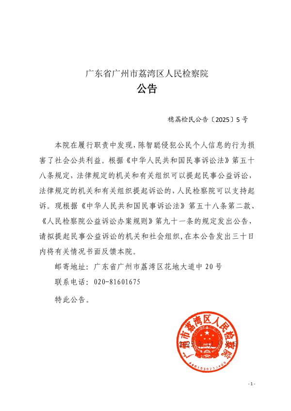 本院在履行职责中发现,陈智聪侵犯公民个人信息的行为损害了社会公共利益。根据《中华人民共和国民事诉讼法》第五十八条规定,法律规定的机关和有关组织可以提起民事公益诉讼,法律规定的机关和有关组织提起诉讼的,人民检察院可以支持起诉。现根据《中华人民共和国民事诉讼法》第五十八条第二款、《人民检察院公益诉讼办案规则》第九十一条的规定发出公告,请拟提起民事公益诉讼的机关和社会组织,在本公告发出三十日内将有关情况书面反馈本院。