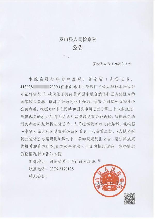 本院在履行职责中发现,郭宗福(身份证号:413028********7030)在未向林业主管部门申请办理林木采伐许可证的情况下,砍伐位于河南董寨国家级自然保护区实验区内的国家级公益林,破坏了当地的林业资源,损害了国家利益和社会公共利益。根据《中华人民共和国民事诉讼法》第五十八条规定,法律规定的机关和有关组织可以提起民事公益诉讼,法律规定的机关和有关组织提起诉讼的,人民检察院可以支持起诉。现根据《中华人民共和国民事诉讼法》第五十八条第二款、《人民检察院公益诉讼办案规则》第九十一条的规定发出公告,请法律规定的机关和有关组织,在本公告发出三十日内提起诉讼,并将提起诉讼情况书面告知本院。