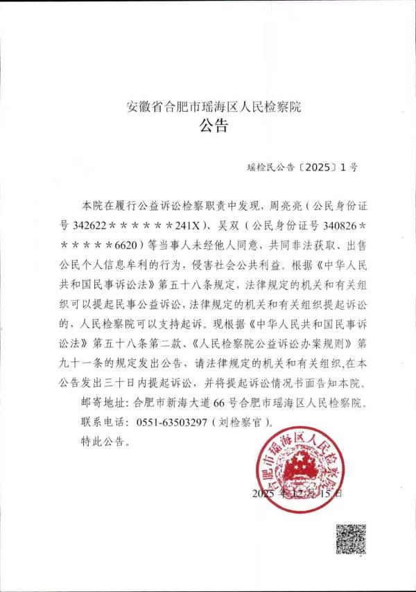 本院在履行公益诉讼检察职责中发现,周亮亮(公民身份证号342622******241X)、吴双(公民身份证号340826******6620)等当事人未经他人同意,共同非法获取、出售公民个人信息牟利的行为,侵害社会公共利益。根据《中华人民共和国民事诉讼法》第五十八条规定,法律规定的机关和有关组织可以提起民事公益诉讼,法律规定的机关和有关组织提起诉讼的,人民检察院可以支持起诉。现根据《中华人民共和国民事诉讼法》第五十八条第二款、《人民检察院公益诉讼办案规则》第九十一条的规定发出公告,请法律规定的机关和有关组织,在本公告发出三十日内提起诉讼,并将提起诉讼情况书面告知本院。