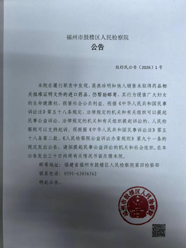 本院在履行职责中发现,莫燕珍明知他人销售未取得药品相关批准证明文件的进口药品,仍帮助邮寄,其行为侵害广大妇女的生命健康权,损害社会公共利益。根据《中华人民共和国民事诉讼法》第五十八条规定,法律规定的机关和有关组织可以提起民事公益诉讼,法律规定的机关和有关组织提起诉讼的,人民检察院可以支持起诉。现根据《中华人民共和国民事诉讼法》第五十八条第二款、《人民检察院公益诉讼办案规则》第九十一条的规定发出公告,请拟提起民事公益诉讼的机关和社会组织,在本公告发出三十日内将有关情况书面反馈本院。