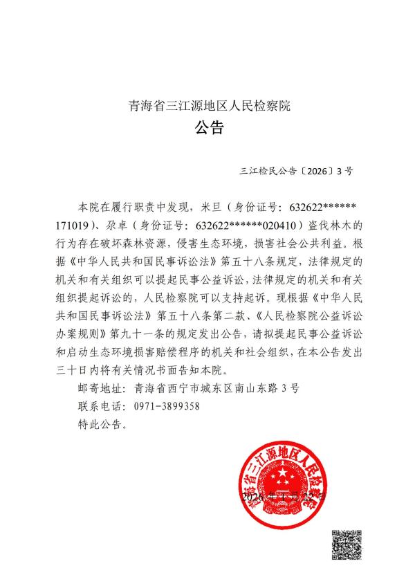本院在履行职责中发现,米旦(身份证号:632622******171019)、尕卓(身份证号:632622******020410)盗伐林木的行为存在破坏森林资源,侵害生态环境,损害社会公共利益。根据《中华人民共和国民事诉讼法》第五十八条规定,法律规定的机关和有关组织可以提起民事公益诉讼,法律规定的机关和有关组织提起诉讼的,人民检察院可以支持起诉。现根据《中华人民共和国民事诉讼法》第五十八条第二款、《人民检察院公益诉讼办案规则》第九十一条的规定发出公告,请拟提起民事公益诉讼和启动生态环境损害赔偿程序的机关和社会组织,在本公告发出三十日内将有关情况书面告知本院。