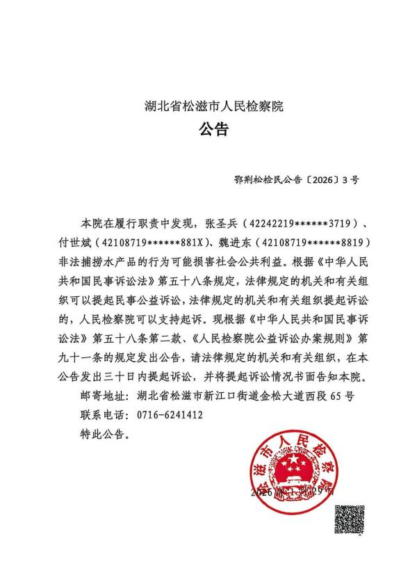 本院在履行职责中发现,张圣兵(42242219******3719)、付世斌(42108719******881X)、魏进东(42108719********8819)非法捕捞水产品的行为可能损害社会公共利益。根据《中华人民共和国民事诉讼法》第五十八条规定,法律规定的机关和有关组织可以提起民事公益诉讼,法律规定的机关和有关组织提起诉讼的,人民检察院可以支持起诉。现根据《中华人民共和国民事诉讼法》第五十八条第二款、《人民检察院公益诉讼办案规则》第九十一条的规定发出公告,请法律规定的机关和有关组织,在本公告发出三十日内提起诉讼,并将提起诉讼情况书面告知本院。