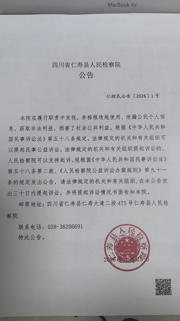 本院在履行职责中发现,李棕根违规使用、泄漏公民个人信息,获取非法利益,损害了社会公共利益。根据《中华人民共和国民事诉讼法》第五十八条规定,法律规定的机关和有关组织可以提起民事公益诉讼,法律规定的机关和有关组织提起诉讼的,人民检察院可以支持起诉。现根据《中华人民共和国民事诉讼法》第五十八条第二款、《人民检察院公益诉讼办案规则》第九十一条的规定发出公告,请法律规定的机关和有关组织,在本公告发出三十日内提起诉讼,并将提起诉讼情况书面告知本院。
