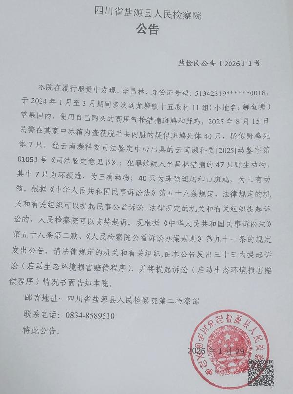 本院在履行职责中发现,李昌林、身份证号码:51342319******0018,于2024年1月至3月期间多次到龙塘镇十五股村11组(小地名:鲤鱼塘)苹果园内,使用自己购买的高压气枪猎捕斑鸠和野鸡,2025年8月15日民警在其家中冰箱内查获脱毛去内脏的疑似斑鸠死体40只,疑似野鸡死体7只。经云南濒科委司法鉴定中心出具的云南濒科委[2025]动鉴字第01051号《司法鉴定意见书》:犯罪嫌疑人李昌林猎捕的47只野生动物,其中7只为环颈雉,为三有动物;40只为珠颈斑鸠和山斑鸠,为三有动物。根据《中华人民共和国民事诉讼法》第五十八条规定,法律规定的机关和有关组织可以提起民事公益诉讼,法律规定的机关和有关组织提起诉讼的,人民检察院可以支持起诉。现根据《中华人民共和国民事诉讼法》第五十八条第二款、《人民检察院公益诉讼办案规则》第九十一条的规定发出公告,请法律规定的机关和有关组织,在本公告发出三十日内提起诉讼(启动生态环境损害赔偿程序),并将提起诉讼(启动生态环境损害赔偿程序)情况书面告知本院。
