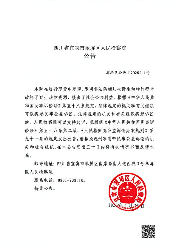 本院在履行职责中发现,罗明非法猎捕陆生野生动物的行为破坏了野生动物资源,损害了社会公共利益。根据《中华人民共和国民事诉讼法》第五十八条规定,法律规定的机关和有关组织可以提起民事公益诉讼,法律规定的机关和有关组织提起诉讼的,人民检察院可以支持起诉。现根据《中华人民共和国民事诉讼法》第五十八条第二款、《人民检察院公益诉讼办案规则》第九十一条的规定发出公告,请拟提起刑事附带民事公益诉讼的机关和社会组织,在本公告发出三十日内将有关情况书面反馈本院。