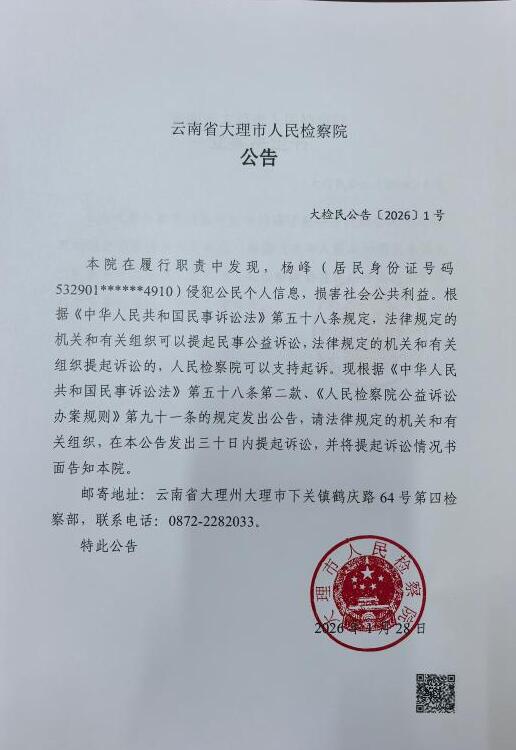 本院在履行职责中发现,杨峰(居民身份证号码532901******4910)侵犯公民个人信息,损害社会公共利益。根据《中华人民共和国民事诉讼法》第五十八条规定,法律规定的机关和有关组织可以提起民事公益诉讼,法律规定的机关和有关组织提起诉讼的,人民检察院可以支持起诉。现根据《中华人民共和国民事诉讼法》第五十八条第二款、《人民检察院公益诉讼办案规则》第九十一条的规定发出公告,请法律规定的机关和有关组织,在本公告发出三十日内提起诉讼,并将提起诉讼情况书面告知本院。