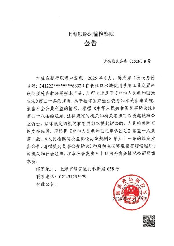本院在履行职责中发现,2025年8月,蒋成东(公民身份号码:341222********6832)在长江口水域使用禁用工具定置串联倒须笼壶非法捕捞水产品,其行为违反了《中华人民共和国渔业法》第三十条的规定,属于破坏国家渔业资源和水域生态系统,损害社会公共利益的情形。根据《中华人民共和国民事诉讼法》第五十八条的规定,法律规定的机关和有关组织可以提起民事公益诉讼,法律规定的机关和有关组织提起诉讼的,人民检察院可以支持起诉。现根据《中华人民共和国民事诉讼法》第五十八条第二款、《人民检察院公益诉讼办案规则》第九十一条的规定发出公告,请拟提起民事公益诉讼(和启动生态环境损害赔偿程序)的机关和社会组织,在本公告发出三十日内将有关情况书面反馈本院。