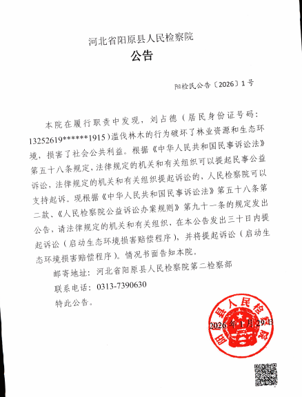 本院在履行职责中发现,刘占德(居民身份证号码:13252619******1915)滥伐林木的行为破坏了林业资源和生态环境,损害了社会公共利益。根据《中华人民共和国民事诉讼法》第五十八条规定,法律规定的机关和有关组织可以提起民事公益诉讼,法律规定的机关和有关组织提起诉讼的,人民检察院可以支持起诉。现根据《中华人民共和国民事诉讼法》第五十八条第二款、《人民检察院公益诉讼办案规则》第九十一条的规定发出公告,请法律规定的机关和有关组织,在本公告发出三十日内提起诉讼(启动生态环境损害赔偿程序),并将提起诉讼(启动生态环境损害赔偿程序)。情况书面告知本院。