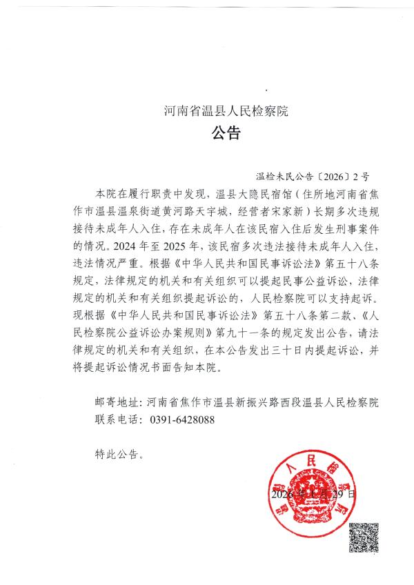 本院在履行职责中发现,温县大隐民宿馆(住所地河南省焦作市温县温泉街道黄河路天宇城,经营者宋家新)长期多次违规接待未成年人入住,存在未成年人在该民宿入住后发生刑事案件的情况。2024年至2025年,该民宿多次违法接待未成年人入住,违法情况严重。根据《中华人民共和国民事诉讼法》第五十八条规定,法律规定的机关和有关组织可以提起民事公益诉讼,法律规定的机关和有关组织提起诉讼的,人民检察院可以支持起诉。现根据《中华人民共和国民事诉讼法》第五十八条第二款、《人民检察院公益诉讼办案规则》第九十一条的规定发出公告,请法律规定的机关和有关组织,在本公告发出三十日内提起诉讼,并将提起诉讼情况书面告知本院。