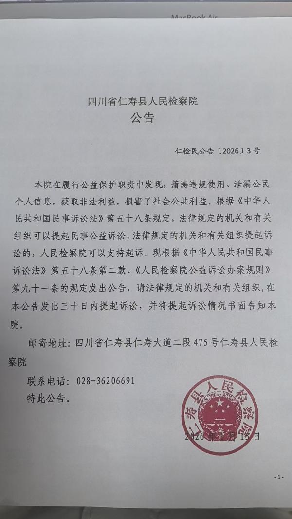 本院在履行职责中发现,蒲涛违规使用、泄漏公民个人信息,获取非法利益,损害了社会公共利益。根据《中华人民共和国民事诉讼法》第五十八条规定,法律规定的机关和有关组织可以提起民事公益诉讼,法律规定的机关和有关组织提起诉讼的,人民检察院可以支持起诉。现根据《中华人民共和国民事诉讼法》第五十八条第二款、《人民检察院公益诉讼办案规则》第九十一条的规定发出公告,请拟提起民事公益诉讼的机关和社会组织在本公告发出三十日内将有关情况书面反馈本院。