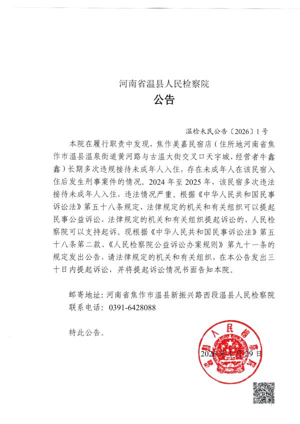 本院在履行职责中发现,焦作美嘉民宿店(住所地河南省焦作市温县温泉街道黄河路与古温大街交叉口天宇城,经营者牛鑫鑫)长期多次违规接待未成年人入住,存在未成年人在该民宿入住后发生刑事案件的情况。2024年至2025年,该民宿多次违法接待未成年人入住,违法情况严重。根据《中华人民共和国民事诉讼法》第五十八条规定,法律规定的机关和有关组织可以提起民事公益诉讼,法律规定的机关和有关组织提起诉讼的,人民检察院可以支持起诉。现根据《中华人民共和国民事诉讼法》第五十八条第二款、《人民检察院公益诉讼办案规则》第九十一条的规定发出公告,请法律规定的机关和有关组织,在本公告发出三十日内提起诉讼,并将提起诉讼情况书面告知本院。