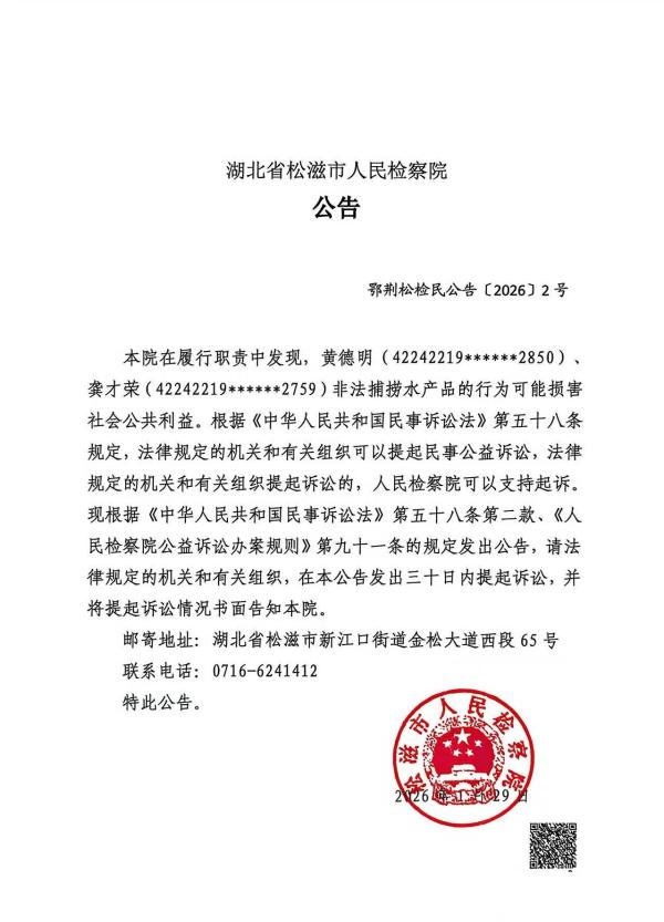 本院在履行职责中发现,黄德明(42242219******2850)、龚才荣(42242219******2759)非法捕捞水产品的行为可能损害社会公共利益。根据《中华人民共和国民事诉讼法》第五十八条规定,法律规定的机关和有关组织可以提起民事公益诉讼,法律规定的机关和有关组织提起诉讼的,人民检察院可以支持起诉。现根据《中华人民共和国民事诉讼法》第五十八条第二款、《人民检察院公益诉讼办案规则》第九十一条的规定发出公告,请法律规定的机关和有关组织,在本公告发出三十日内提起诉讼,并将提起诉讼情况书面告知本院。