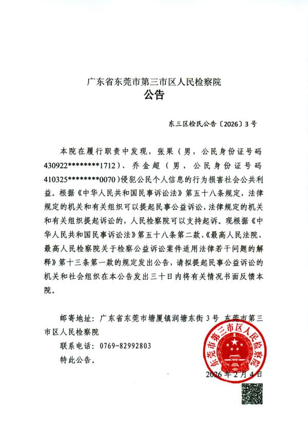本院在履行职责中发现,张果(男,公民身份证号码430922********1712)、乔金超(男,公民身份证号码410325********0070)侵犯公民个人信息的行为损害社会公共利益。根据《中华人民共和国民事诉讼法》第五十八条规定,法律规定的机关和有关组织可以提起民事公益诉讼,法律规定的机关和有关组织提起诉讼的,人民检察院可以支持起诉。现根据《中华人民共和国民事诉讼法》第五十八条第二款、《最高人民法院、最高人民检察院关于检察公益诉讼案件适用法律若干问题的解释》第十三条第一款的规定发出公告,请拟提起民事公益诉讼的机关和社会组织在本公告发出三十日内将有关情况书面反馈本院。