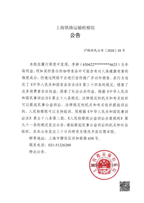 本院在履行职责中发现,李婷(430422********4623)为牟取利益,明知其所售壮阳咖啡食品中可能含有对人体健康有害的物质成分,仍通过网络平台进行宣传推广并对外销售,其行为违反了《中华人民共和国食品安全法》第三十四条的规定,侵害了众多消费者合法权益,损害了社会公共利益。根据《中华人民共和国民事诉讼法》第五十八条规定,法律规定的机关和有关组织可以提起民事公益诉讼,法律规定的机关和有关组织提起诉讼的,人民检察院可以支持起诉。现根据《中华人民共和国民事诉讼法》第五十八条第二款、《人民检察院公益诉讼办案规则》第九十一条的规定发出公告,请拟提起民事公益诉讼的机关和社会组织,在本公告发出三十日内将有关情况书面反馈本院。