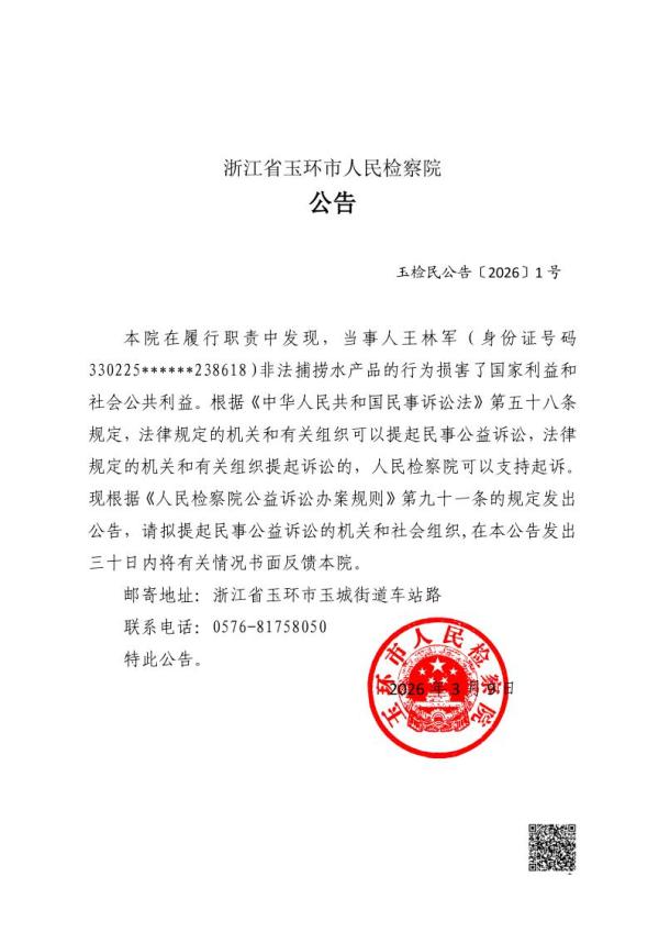 本院在履行职责中发现,当事人王林军(身份证号码330225******238618)非法捕捞水产品的行为损害了国家利益和社会公共利益。根据《中华人民共和国民事诉讼法》第五十八条规定,法律规定的机关和有关组织可以提起民事公益诉讼,法律规定的机关和有关组织提起诉讼的,人民检察院可以支持起诉。现根据《人民检察院公益诉讼办案规则》第九十一条的规定发出公告,请拟提起民事公益诉讼的机关和社会组织,在本公告发出三十日内将有关情况书面反馈本院。