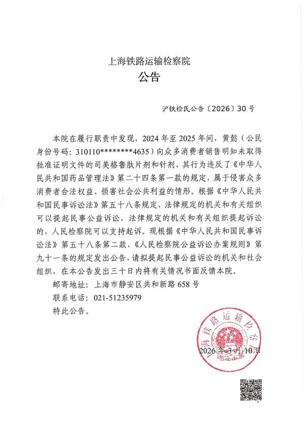 本院在履行职责中发现,2024年至2025年间,黄懿(公民身份号码:310110********4635)向众多消费者销售明知未取得批准证明文件的司美格鲁肽片剂和针剂,其行为违反了《中华人民共和国药品管理法》第二十四条第一款的规定,属于侵害众多消费者合法权益、损害社会公共利益的情形。根据《中华人民共和国民事诉讼法》第五十八条规定,法律规定的机关和有关组织可以提起民事公益诉讼,法律规定的机关和有关组织提起诉讼的,人民检察院可以支持起诉。现根据《中华人民共和国民事诉讼法》第五十八条第二款、《人民检察院公益诉讼办案规则》第九十一条的规定发出公告,请拟提起民事公益诉讼的机关和社会组织,在本公告发出三十日内将有关情况书面反馈本院。
