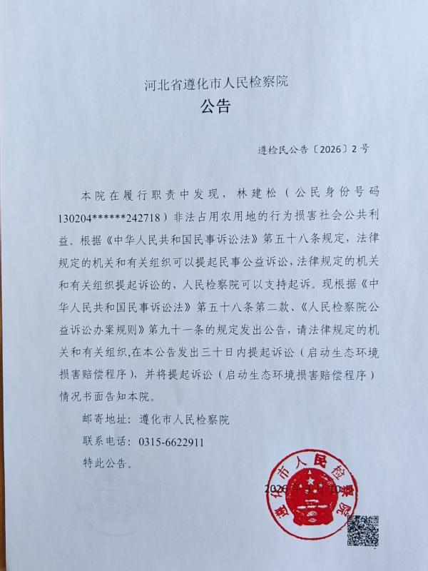 本院在履行职责中发现,林建松(公民身份号码130204******242718)非法占用农用地的行为损害社会公共利益。根据《中华人民共和国民事诉讼法》第五十八条规定,法律规定的机关和有关组织可以提起民事公益诉讼,法律规定的机关和有关组织提起诉讼的,人民检察院可以支持起诉。现根据《中华人民共和国民事诉讼法》第五十八条第二款、《人民检察院公益诉讼办案规则》第九十一条的规定发出公告,请法律规定的机关和有关组织,在本公告发出三十日内提起诉讼(启动生态环境损害赔偿程序),并将提起诉讼(启动生态环境损害赔偿程序)情况书面告知本院。