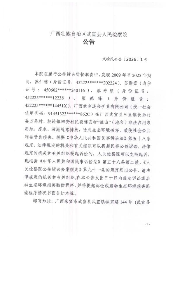 本院在履行公益诉讼监督职责中,发现2009年至2025年期间,苏仁连(身份证号:452225******202224)、苏勤豪(身份证号:450602******240116)、廖寿频(身份证号:452225******12238)、廖德锋(身份证号:452225******14451X)、广西武宣连兴矿业有限公司(统一社会信用代码:91451323******862C)在广西武宣县三里镇长乐村委万昌村、桐岭镇四安村民委连安村“独山”(地名)非法占用农用地,废水、污泥随意排放,造成生态环境破坏,致使社会公共利益受到损害。根据《中华人民共和国民事诉讼法》第五十八条规定,法律规定的机关和有关组织可以提起民事公益诉讼,法律规定的机关和有关组织提起诉讼的,人民检察院可以支持起诉。现根据《中华人民共和国民事诉讼法》第五十八条第二款、《人民检察院公益诉讼办案规则》第九十一条的规定发出公告,请法律规定的机关和有关组织,在本公告发出三十日内提起诉讼或启动生态环境损害赔偿程序,并将提起诉讼或启动生态环境损害赔偿程序情况书面告知本院。