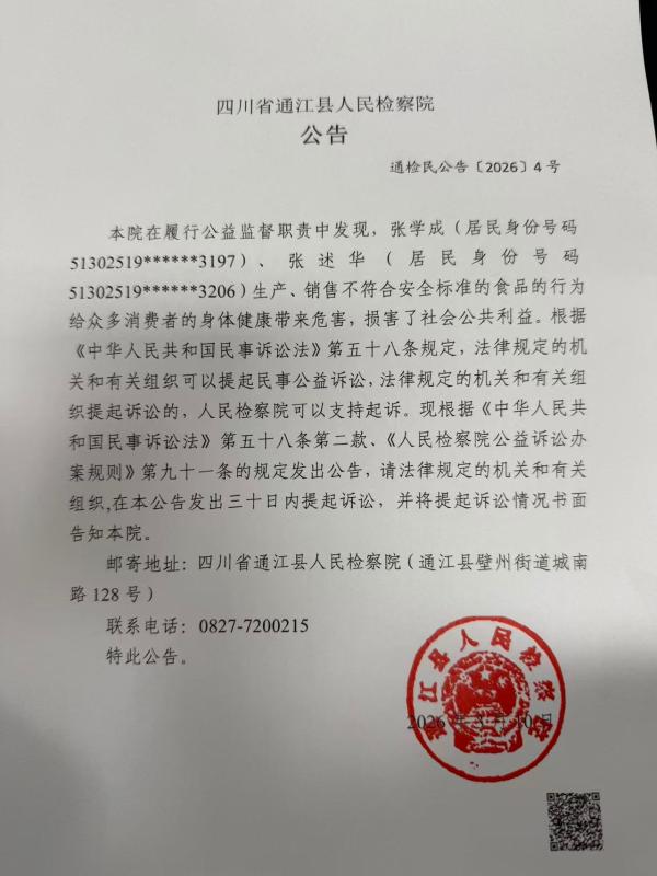 本院在履行公益监督职责中发现,张学成(居民身份号码51302519******3197)、张述华(居民身份号码51302519******3206)生产、销售不符合安全标准的食品的行为给众多消费者的身体健康带来危害,损害了社会公共利益。根据《中华人民共和国民事诉讼法》第五十八条规定,法律规定的机关和有关组织可以提起民事公益诉讼,法律规定的机关和有关组织提起诉讼的,人民检察院可以支持起诉。现根据《中华人民共和国民事诉讼法》第五十八条第二款、《人民检察院公益诉讼办案规则》第九十一条的规定发出公告,请法律规定的机关和有关组织,在本公告发出三十日内提起诉讼,并将提起诉讼情况书面告知本院。