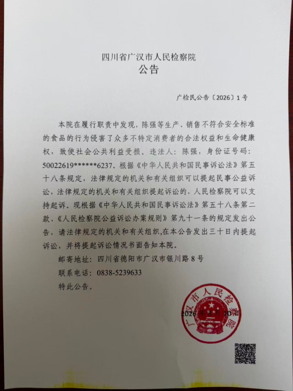 本院在履行职责中发现,陈强等生产、销售不符合安全标准的食品的行为侵害了众多不特定消费者的合法权益和生命健康权,致使社会公共利益受损。违法人:陈强,身份证号码:50022619******6237。根据《中华人民共和国民事诉讼法》第五十八条规定,法律规定的机关和有关组织可以提起民事公益诉讼,法律规定的机关和有关组织提起诉讼的,人民检察院可以支持起诉。现根据《中华人民共和国民事诉讼法》第五十八条第二款、《人民检察院公益诉讼办案规则》第九十一条的规定发出公告,请法律规定的机关和有关组织,在本公告发出三十日内提起诉讼,并将提起诉讼情况书面告知本院。