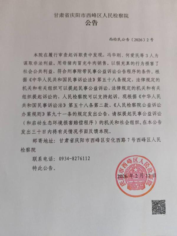 本院在履行审查起诉职责中发现,冯华刚、何爱民等3人为谋取非法利益,用母猪肉冒充牛肉销售,以假充真的行为损害了社会公共利益,符合刑事附带民事公益诉讼公告程序的条件。根据《中华人民共和国民事诉讼法》第五十八条规定,法律规定的机关和有关组织可以提起民事公益诉讼,法律规定的机关和有关组织提起诉讼的,人民检察院可以支持起诉。现根据《中华人民共和国民事诉讼法》第五十八条第二款、《人民检察院公益诉讼办案规则》第九十一条的规定发出公告,请拟提起民事公益诉讼(和启动生态环境损害赔偿程序)的机关和社会组织,在本公告发出三十日内将有关情况书面反馈本院。