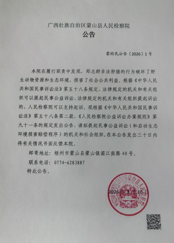 本院在履行职责中发现,郑志群非法狩猎的行为破坏了野生动物资源和生态环境,损害了社会公共利益。根据《中华人民共和国民事诉讼法》第五十八条规定,法律规定的机关和有关组织可以提起民事公益诉讼,法律规定的机关和有关组织提起诉讼的,人民检察院可以支持起诉。现根据《中华人民共和国民事诉讼法》第五十八条第二款,《人民检察院公益诉讼办案规则》第九十一条的规定发出公告,请拟提起民事公益诉讼(和启动生态环境损害赔偿程序)的机关和社会组织,在本公告发出三十日内将有关情况书面反馈本院。