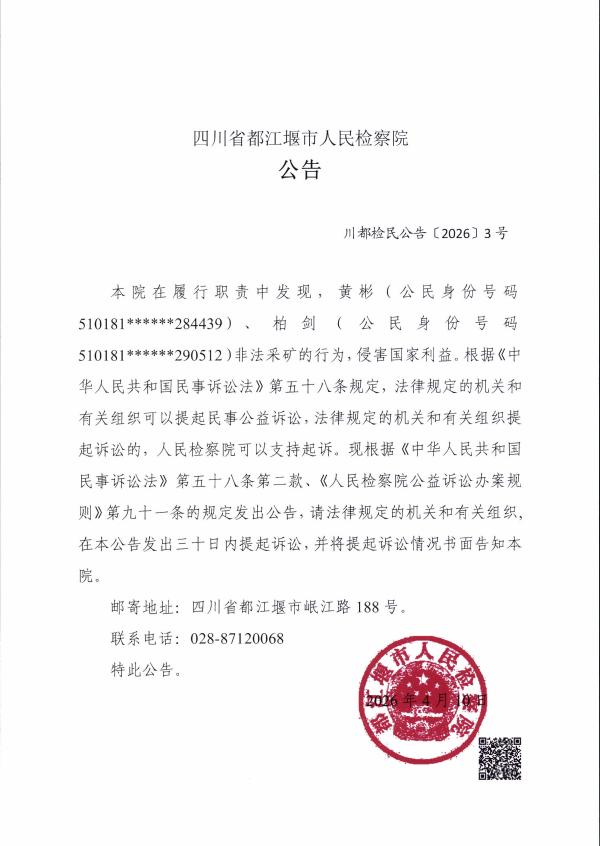 本院在履行职责中发现,黄彬(公民身份号码510181******284439)、柏剑(公民身份号码510181******290512)非法采矿的行为,侵害国家利益。根据《中华人民共和国民事诉讼法》第五十八条规定,法律规定的机关和有关组织可以提起民事公益诉讼,法律规定的机关和有关组织提起诉讼的,人民检察院可以支持起诉。现根据《中华人民共和国民事诉讼法》第五十八条第二款、《人民检察院公益诉讼办案规则》第九十一条的规定发出公告,请法律规定的机关和有关组织,在本公告发出三十日内提起诉讼,并将提起诉讼情况书面告知本院。
