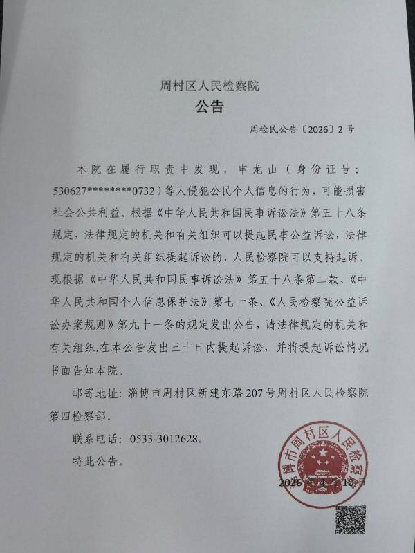 本院在履行职责中发现,申龙山(身份证号:530627********0732)等人侵犯公民个人信息的行为,可能损害社会公共利益。根据《中华人民共和国民事诉讼法》第五十八条规定,法律规定的机关和有关组织可以提起民事公益诉讼,法律规定的机关和有关组织提起诉讼的,人民检察院可以支持起诉。现根据《中华人民共和国民事诉讼法》第五十八条第二款、《中华人民共和国个人信息保护法》第七十条、《人民检察院公益诉讼办案规则》第九十一条的规定发出公告,请法律规定的机关和有关组织,在本公告发出三十日内提起诉讼,并将提起诉讼情况书面告知本院。
