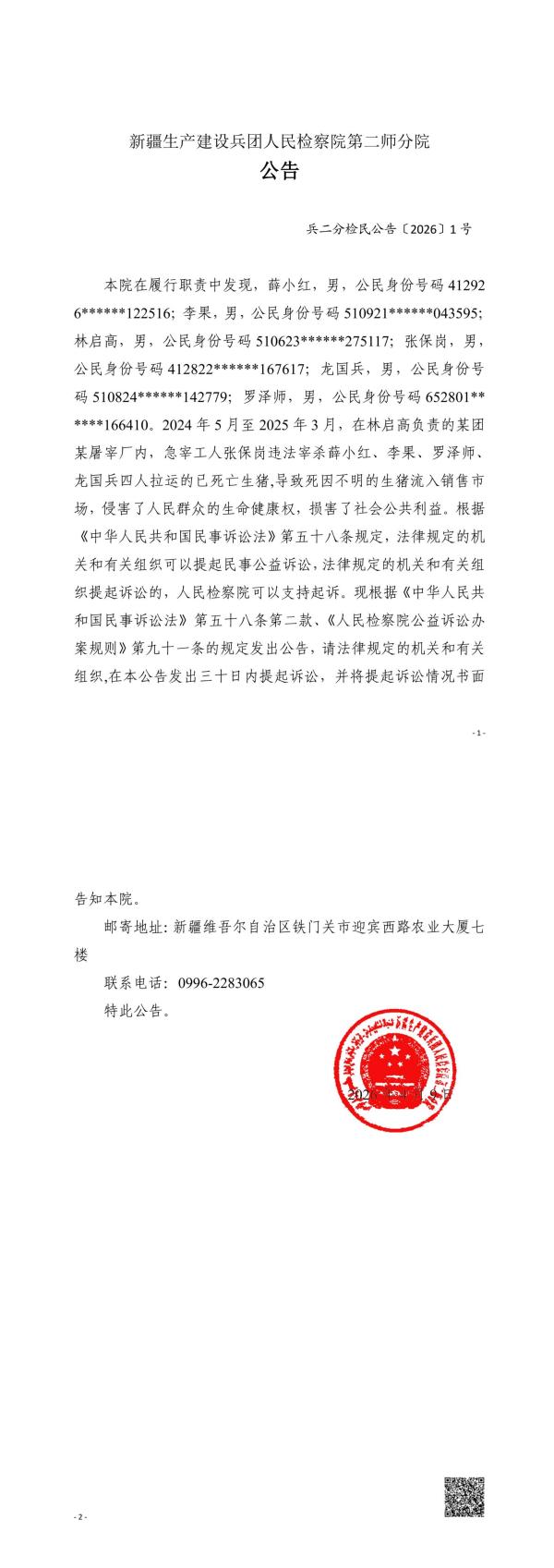 本院在履行职责中发现,薛小红,男,公民身份号码412926******122516;李果,男,公民身份号码510921******043595;林启高,男,公民身份号码510623******275117;张保岗,男,公民身份号码412822******167617;龙国兵,男,公民身份号码510824******142779;罗泽师,男,公民身份号码652801******166410。2024年5月至2025年3月,在林启高负责的某团某屠宰厂内,急宰工人张保岗违法宰杀薛小红、李果、罗泽师、龙国兵四人拉运的已死亡生猪,导致死因不明的生猪流入销售市场,侵害了人民群众的生命健康权,损害了社会公共利益。根据《中华人民共和国民事诉讼法》第五十八条规定,法律规定的机关和有关组织可以提起民事公益诉讼,法律规定的机关和有关组织提起诉讼的,人民检察院可以支持起诉。现根据《中华人民共和国民事诉讼法》第五十八条第二款、《人民检察院公益诉讼办案规则》第九十一条的规定发出公告,请法律规定的机关和有关组织,在本公告发出三十日内提起诉讼,并将提起诉讼情况书面告知本院。